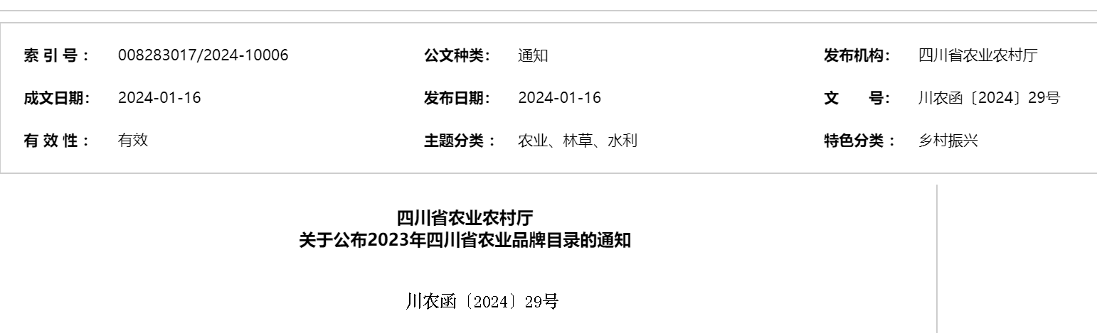 1月16日,四川省農(nóng)業(yè)農(nóng)村廳發(fā)布《關(guān)于公布2023年四川省農(nóng)業(yè)品牌目錄的通知》(以下簡稱“《通知》”),30個區(qū)域公用品牌、46個企業(yè)品牌,78個農(nóng)產(chǎn)品品牌入選2023年四川省農(nóng)業(yè)品牌目錄。