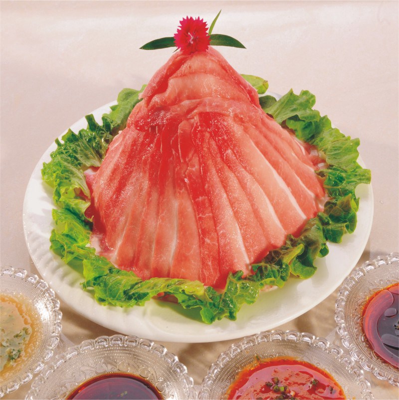 B.中火煮礦泉水(山泉水為最佳,不能使用自來(lái)水,因自來(lái)水中含氯制劑高影響口感),加以姜汁酒,小蔥段,煮開(kāi),下肉片,灼至肉片卷曲,即可撈出,灼好金針菇,灼好有機(jī)蔬菜圍邊。配以香辣蒜蓉碟,小蔥醬油碟、白切姜蔥碟,供蘸食